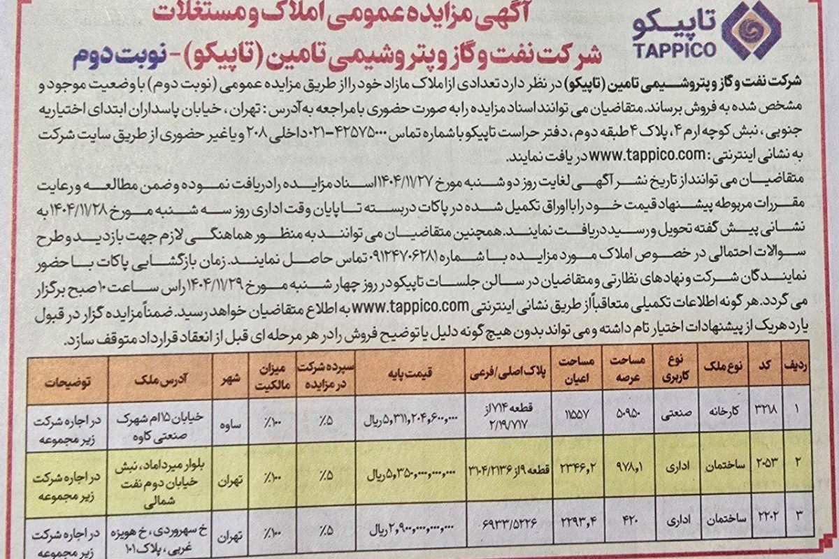 آگهی نوبت دوم مزایده عمومی املاک و مستغلات شرکت نفت و گاز و پتروشیمی تأمین (تاپیکو)