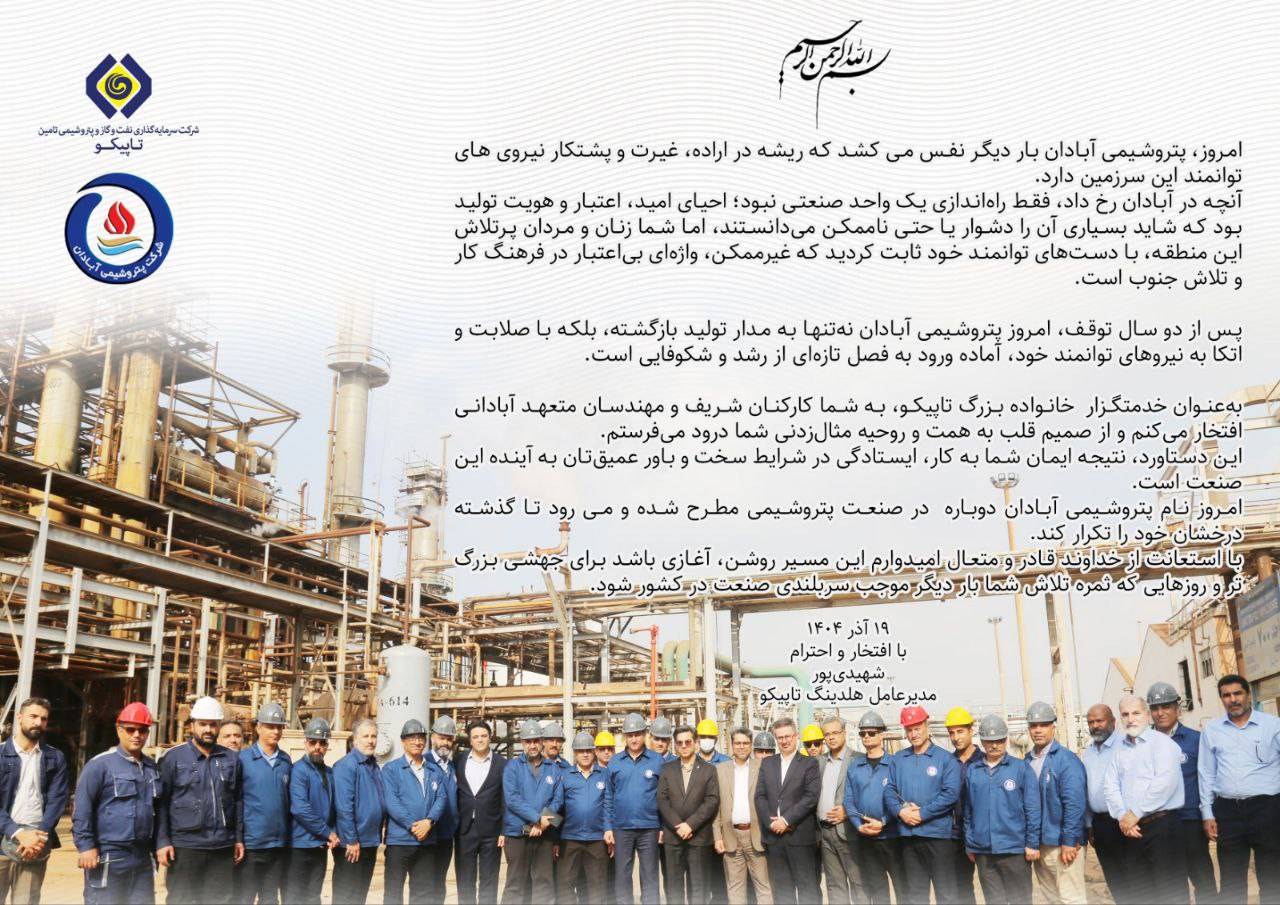 پس از دو سال توقف، امروز پتروشیمی آبادان نهتنها به مدار تولید بازگشته، بلکه با صلابت و اتکا به نیروهای توانمند خود، آماده ورود به فصل تازهای از رشد و شکوفایی است.